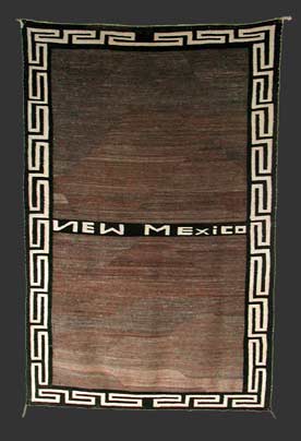 | | A Double Saddle Blanket with Opposing Grey Windows and NEW MEXICO in White Letters, Navajo, circa 1900 - 1910. The blanket measures 40 wide by 62 inches long, as woven an unusually large size for a Navajo double saddle blanket. The grays, the browns and the whites are all un-dyed handspun yarns. |